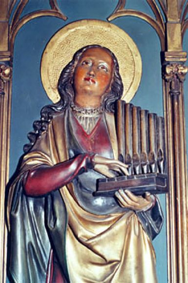In der Stadt der Musik Halle steht auf dem Marktplatz das Denkmal von Händel. Wer das Notenpult betrachtet, erkennt auf ihm das Bild einer Orgelspielerin. Es ist die heilige Cäcilia von Rom. Sie ist auch auf dem Hochaltar in unserer Kirche abgebildet. Ihre Kennzeichen sind Musikinstrumente, meist die Orgel. Sie gilt als Patronin der Kirchenmusik. Der Name wird von "caecus - blind" hergeleitet.