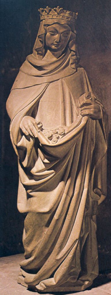 Das Rosenwunder der Elisabeth. Sandsteinstatue in der Elisabethkiche zu Marburg. Als Elisabeth mit Lebensmitteln unter dem Mantel auf dem Weg zu ihren Armen von ihrem Gemahl gefragt wurde, was sie unter dem Mantel trage, sagte sie "Rosen" und, den Mantel zurückschlagend, zeigte sie ihrem Gemahl einen Rosenstrauß, in den die Lebensmittel wunderbar verwandelt waren.