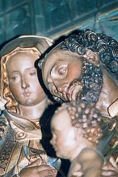In einigen Schriften, die nicht zum Evangelium zählen ("Die Geschichte Josefs", "Jakobusevangelium"), wird er daher als alter Mann geschildert, schon achtzig Jahre alt, als er Maria zur Braut nimmt. Daher steht er auf vielen Darstellungen etwas abseits, teilnahmslos oder gar auf einen Stab gestützt vor sich hindämmernd. Er macht Nebenarbeiten wie Eselführen oder Süppchen kochen. Die "Brüder und Schwestern Jesu" schreibt man einer ersten Ehe des Josef zu. - Ab Beginn der Neuzeit aber wird er dann wieder als Mann im besten Alter dargestellt, oft in seiner Werkstatt. Ein solches Bild sehen wir auch auf unserem Altar.
