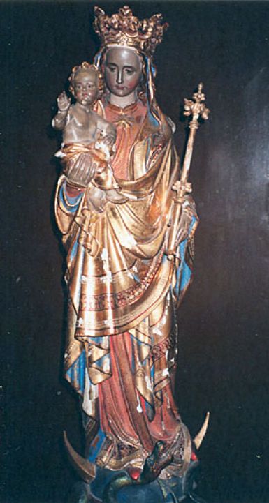 Maria mit Szepter hat das Jesuskind auf dem rechten Arm (angeblich die seltenere Darstellung) und steht auf der Mondsichel. Das Kind zeigt auf eine goldene Kugel, wohl einen goldenen Reichsapfel.