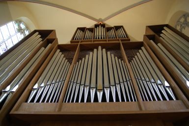 | Bourdon 16' Prinzipal 8' Gemshorn 8' Rohrflöte 8' Oktave 4' Spitzflöte 4' Quinte 2 2/3' Superoktave 2' Waldflöte 2' Mixtur 5f. 1 1/3' Zimbel 3f. 1/2' Trompete 8' Tremulant (2009) | Holzgedackt 8' Rohrflöte 4' Sesquialter 2f. 2 2/3' Prinzipal 2' Quinte 1 1/3' Zimbel 2f. 1/4' Krummhorn 8' (2009) Tremulant |